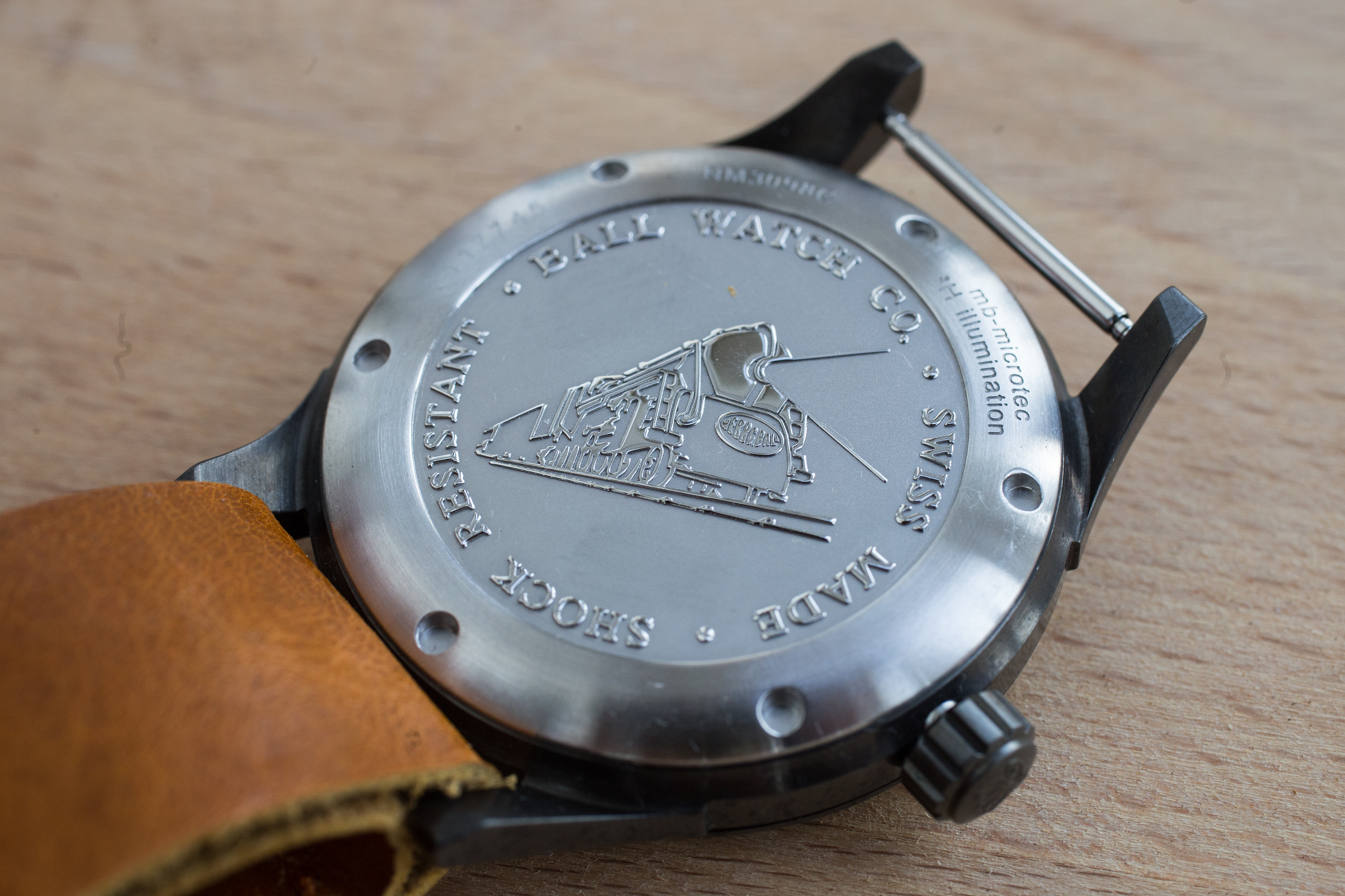 The back is equally pleasing to look at with a carving of a train in relief. Ball Watches history started off as being the official time keeper of the rail roads in the 1800s. The case back also tells us some of the features of the watch. It’s water resistant up to 100 meters/330 feet so you can easily take this to the pool or to the ocean swimming and snorkeling. I would not use it for scuba diving even though it’s waterproof to 330ft, because it lacks a rotating time keeping bezel that keeps track of how much air you have in the tanks.